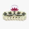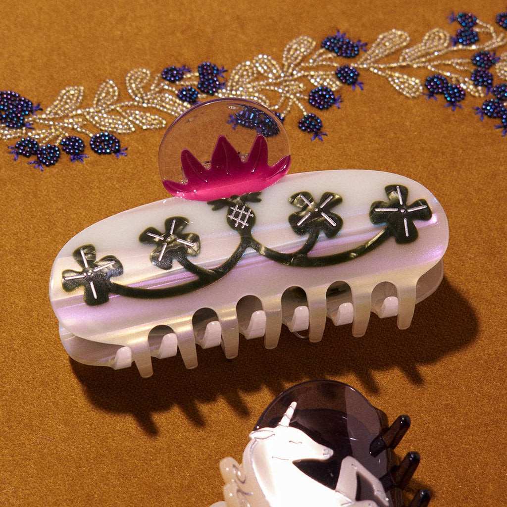 WINONA IRENEA deep red flower peeks out from a meadow of clovers. A claw inspired by the intricate flourishes of medieval manuscripts. The perfect piece for a timeless beauty. The Clover bloom of this claw is encompassed by a semi circle of clear acetate for a more supported grip.