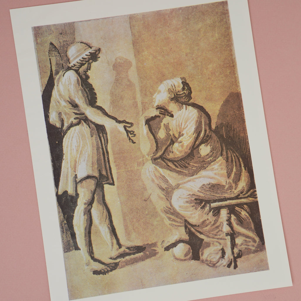 "the subject is probably taken from classical mythology and represents a hero consulting an oracle or sibyl."