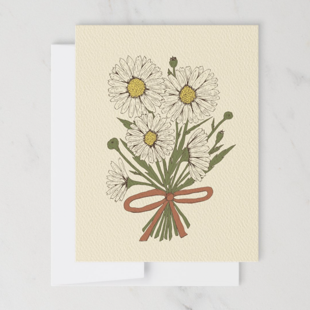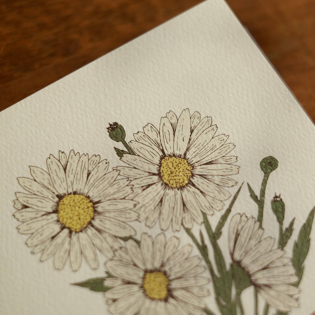 The botanical illustration on this card is an original design by Annalisa Sawtell, professionally-printed on a hand selected natural 100 lb. felt weave card stock for premium quality and an elevated, organic feel. The daisy card is blank on the inside, but bears this text on the back: