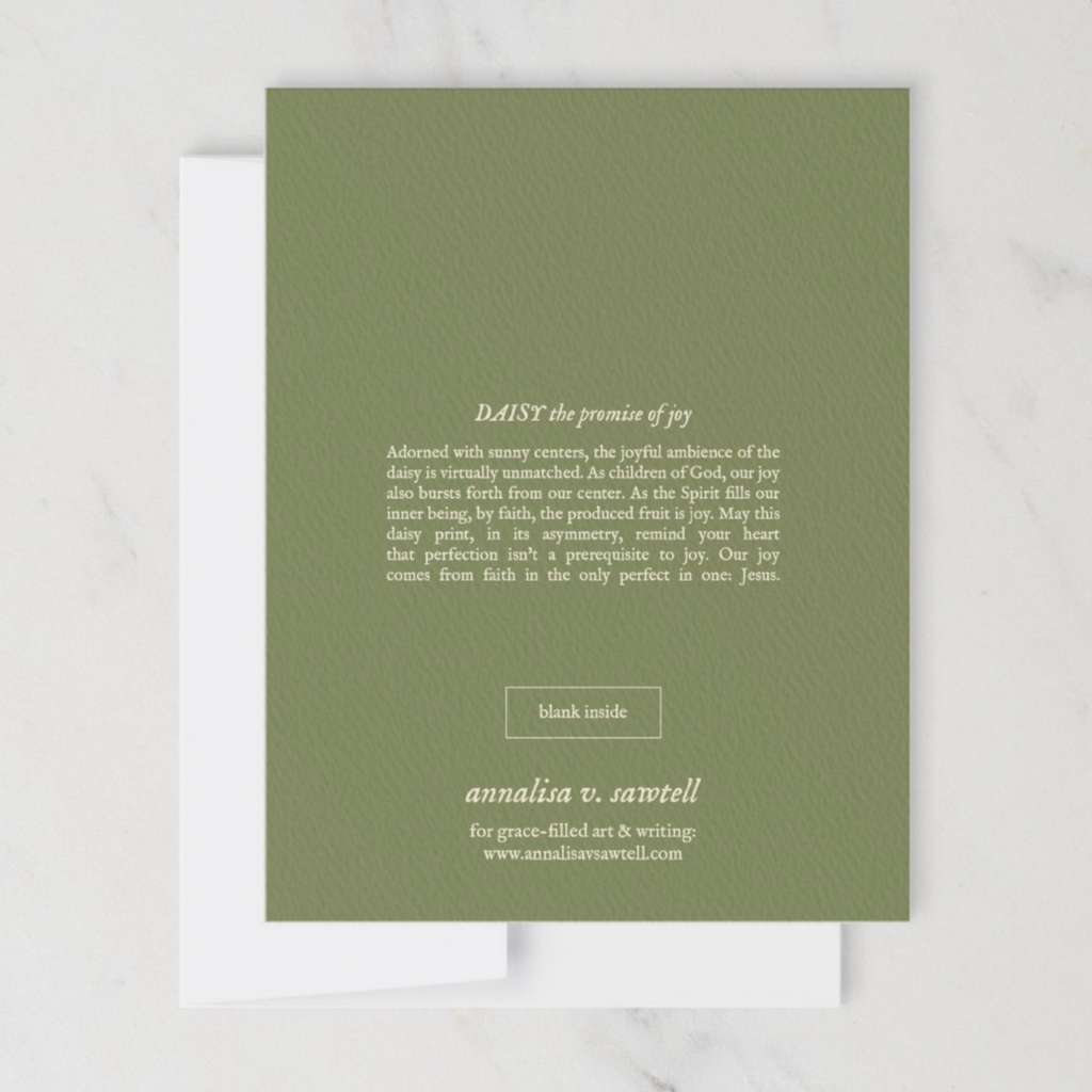 annalisa v. sawtellThis daisy card is a part of the Botanical Promises collection and features a distinct promise of God. These cards are perfect for all-purpose occasions, or for special times of encouragement.