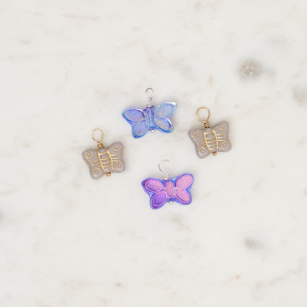 Tiny brass butterfly charms on sterling silver rings ready to string onto a chain, add to a charm bracelet, keychain, or shoes.