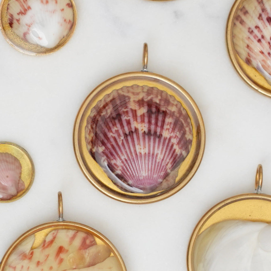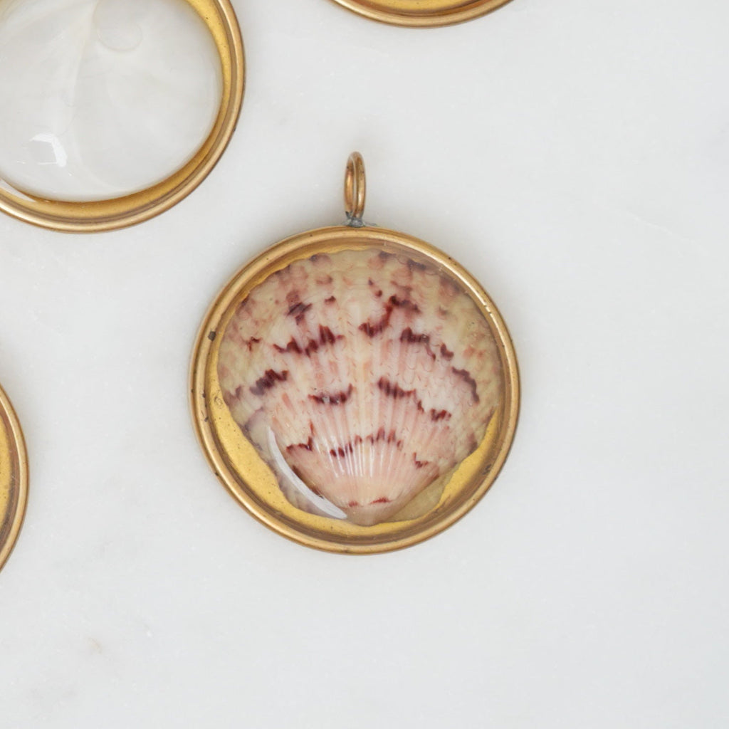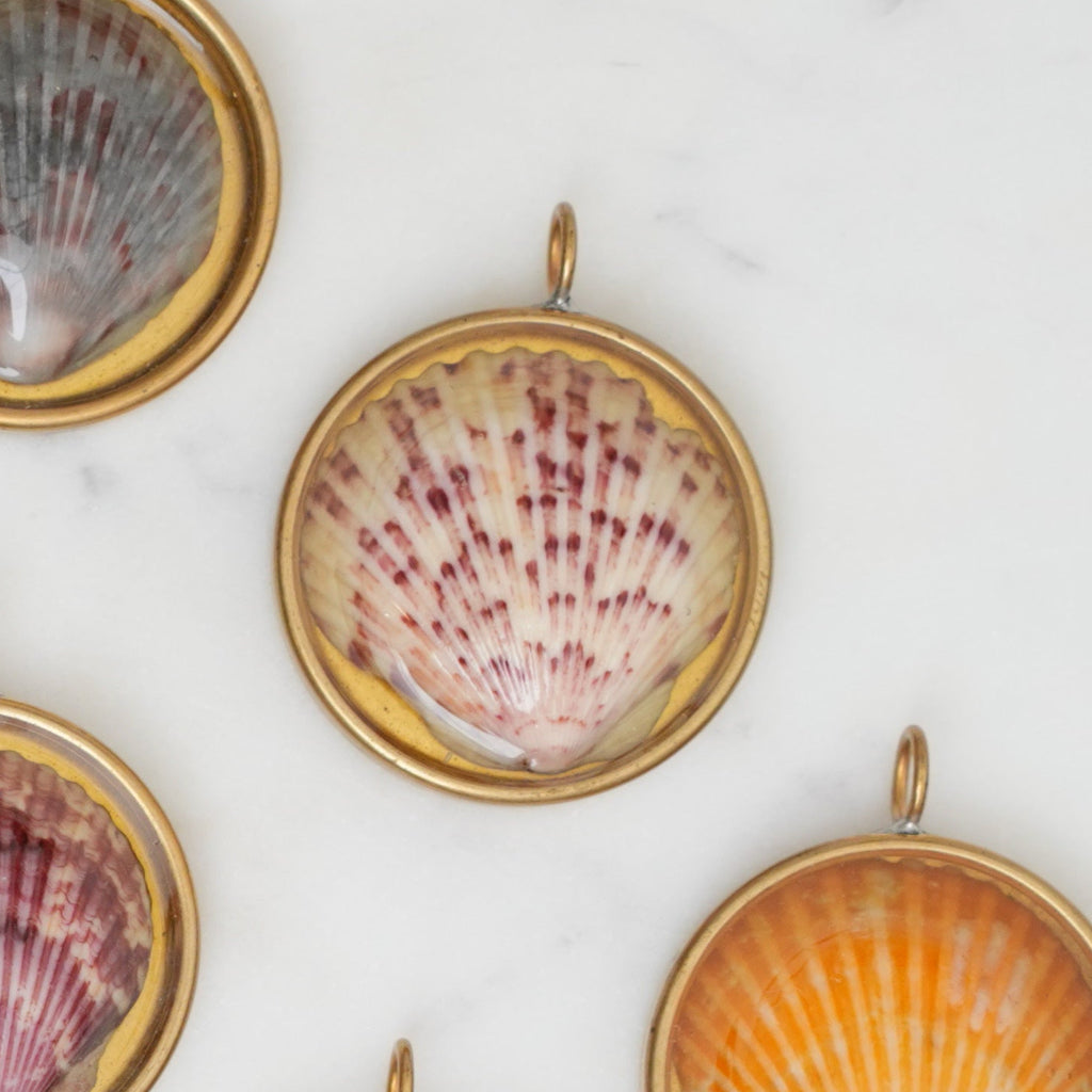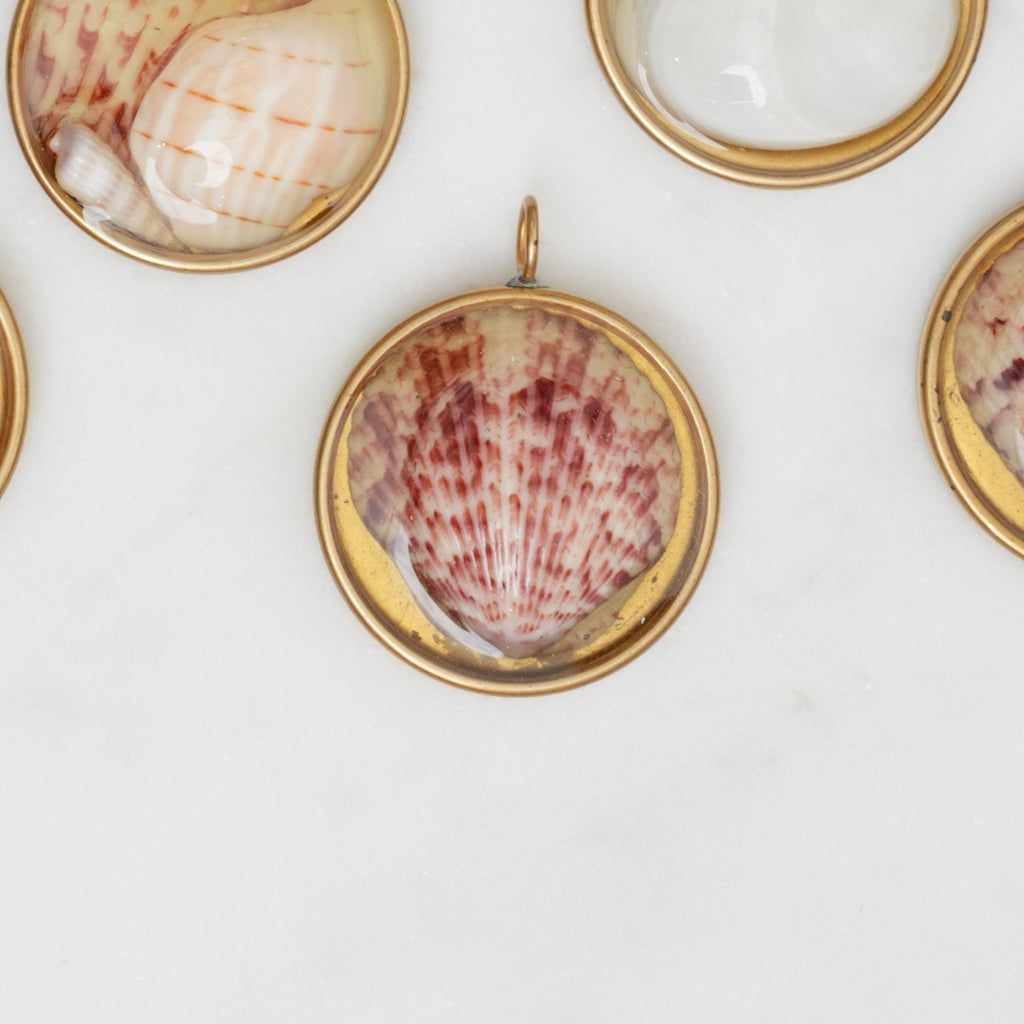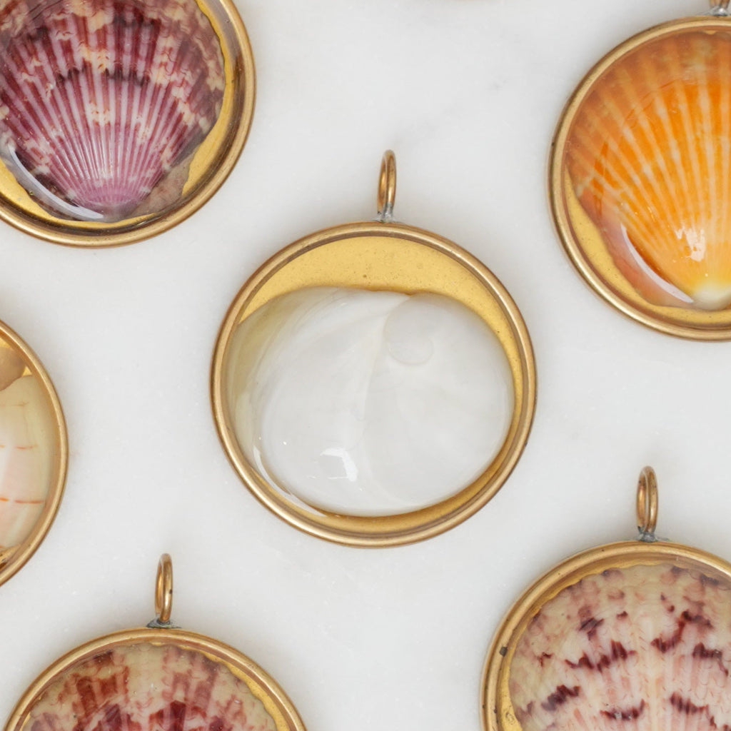 Precious and nostalgic, foraged Sanibel Island shells are set within a brass pendant in jewelers grade resin. These shells are lovely strung on a chain or attached to a charm bracelet.