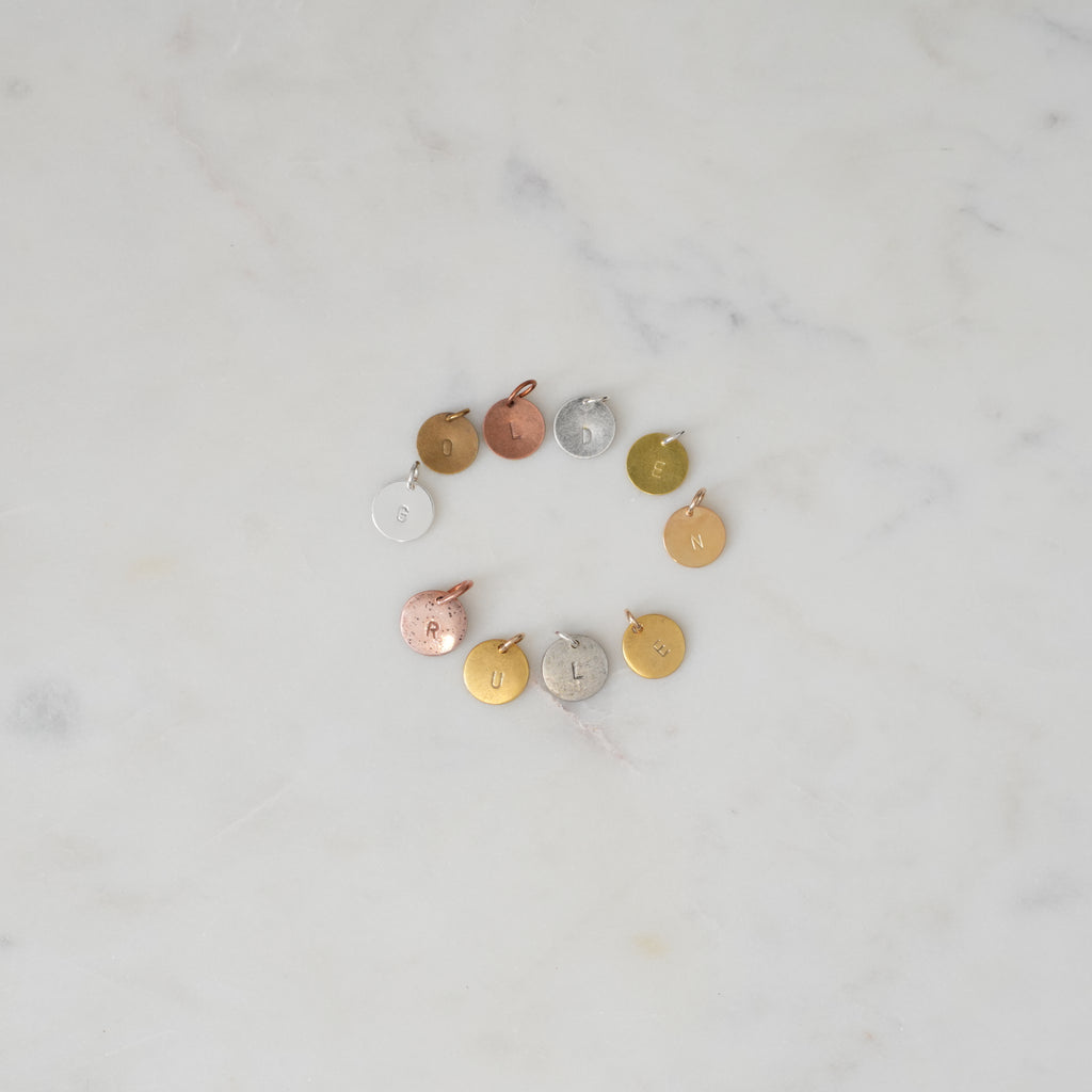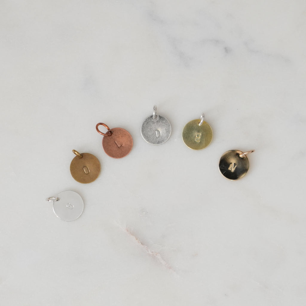 Hand stamped single initial charms made to order on your choice of circle, rectangle, or emerald cut. Each initial is attached to a sterling silver ring for the perfect mixed metal effect. Gold fill rings are available upon request.