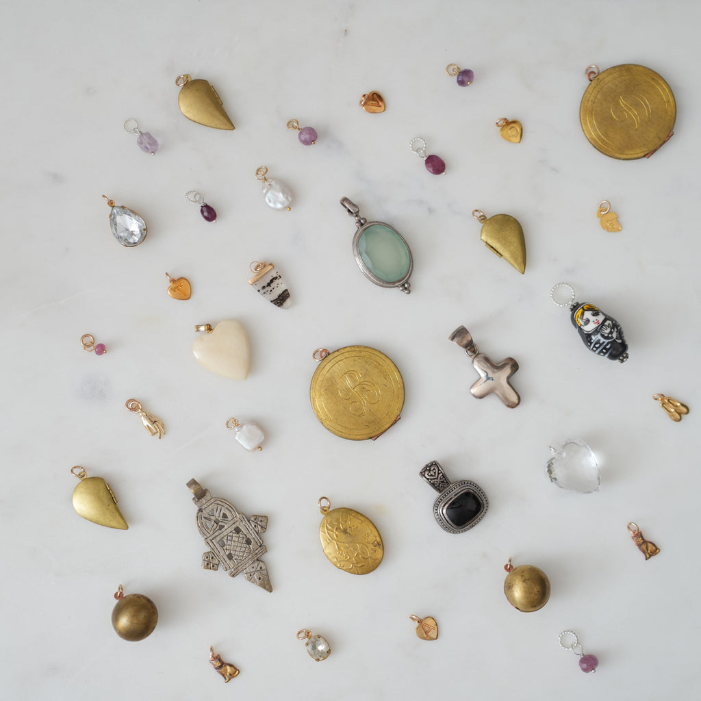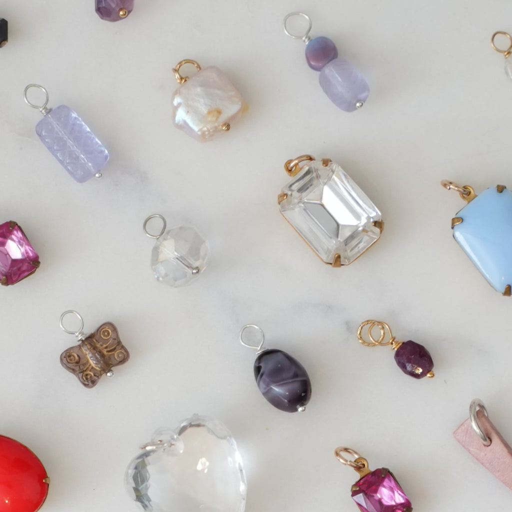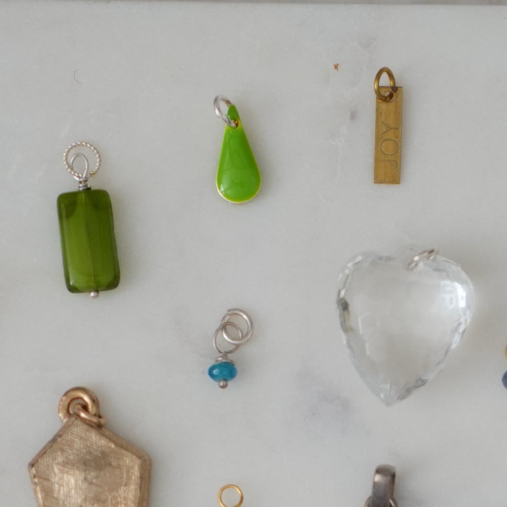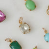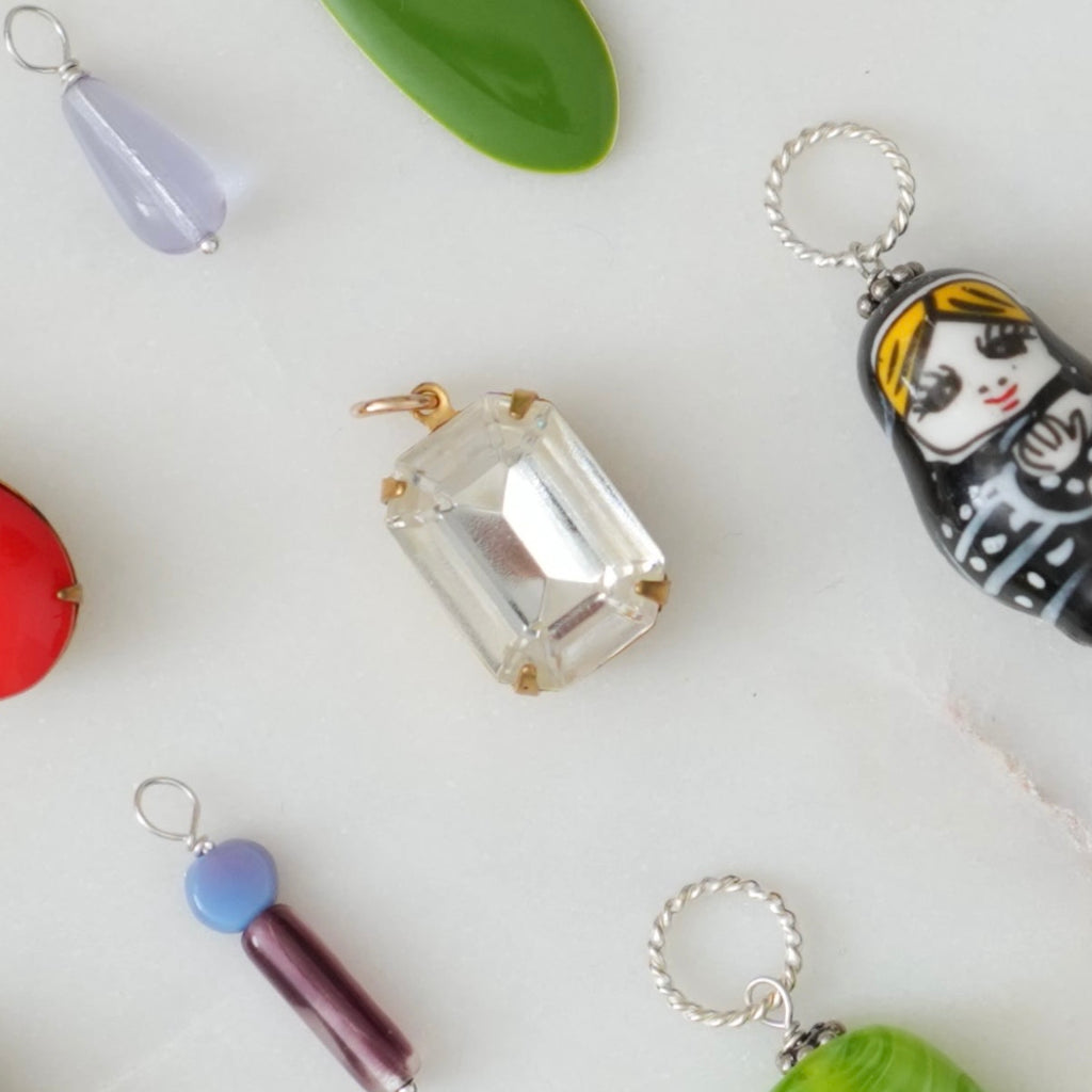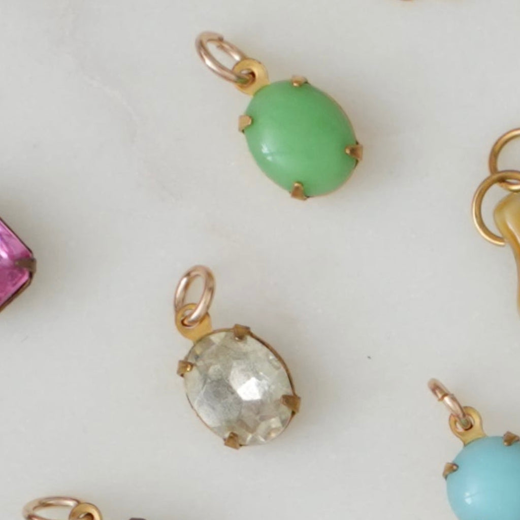 Vintage glass and brass cabochons in faceted clear and neutral tones and enameled brass shapes with 14kt gold fill or sterling silver rings. Pretty little subtle treasures to add to your charm bracelets and necklaces.