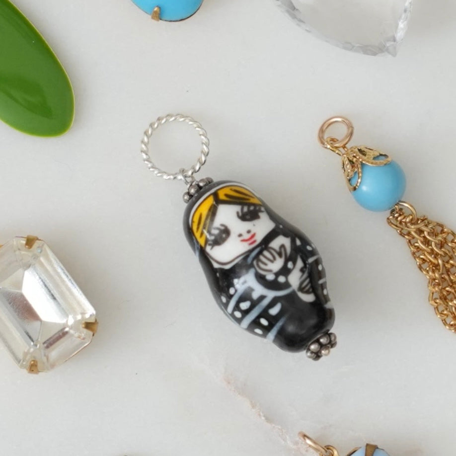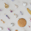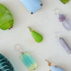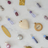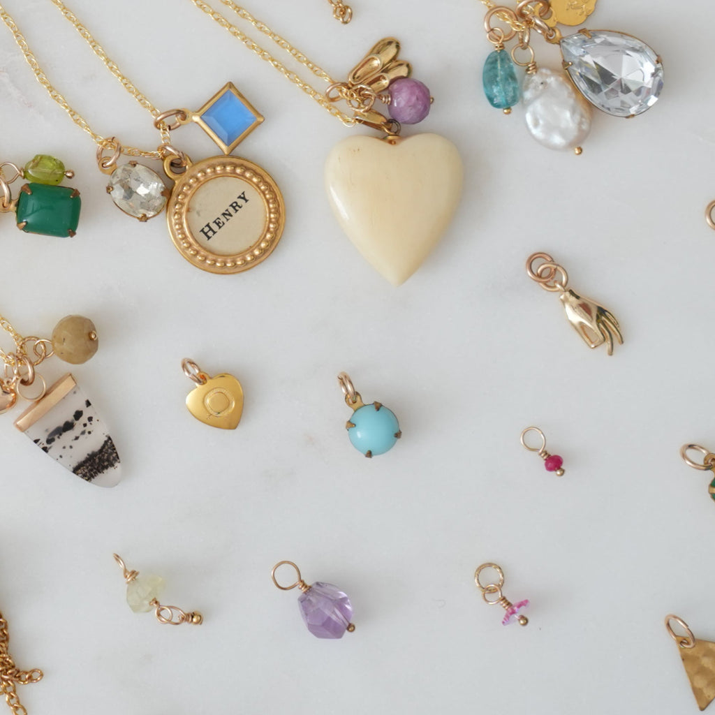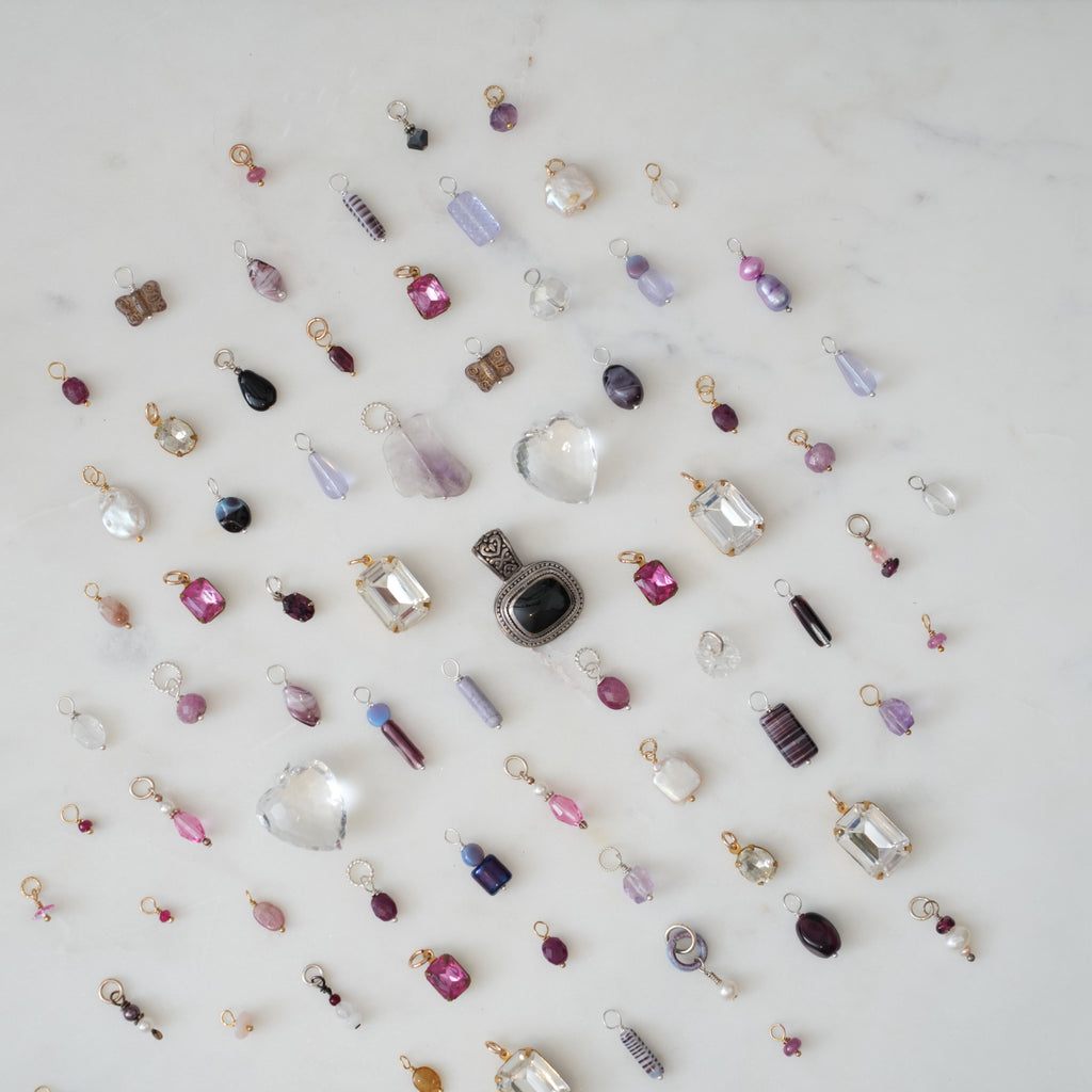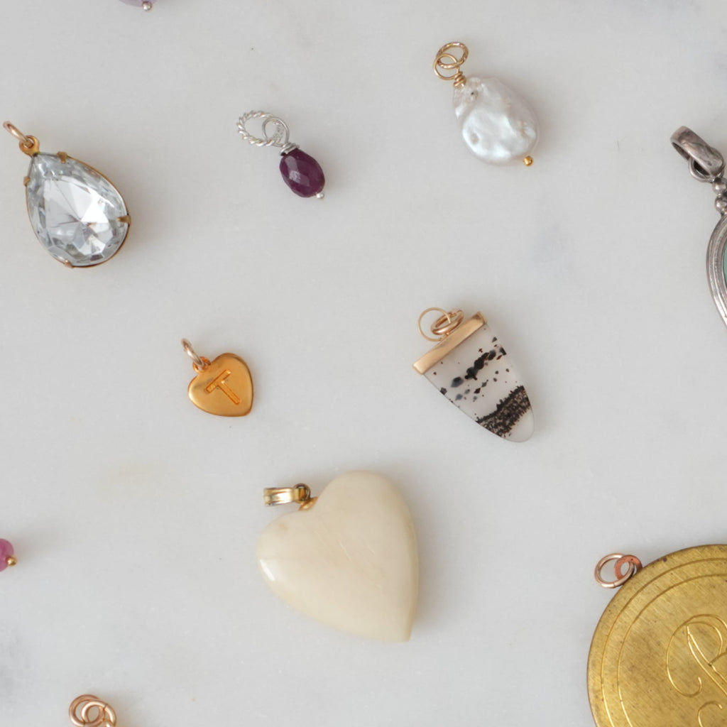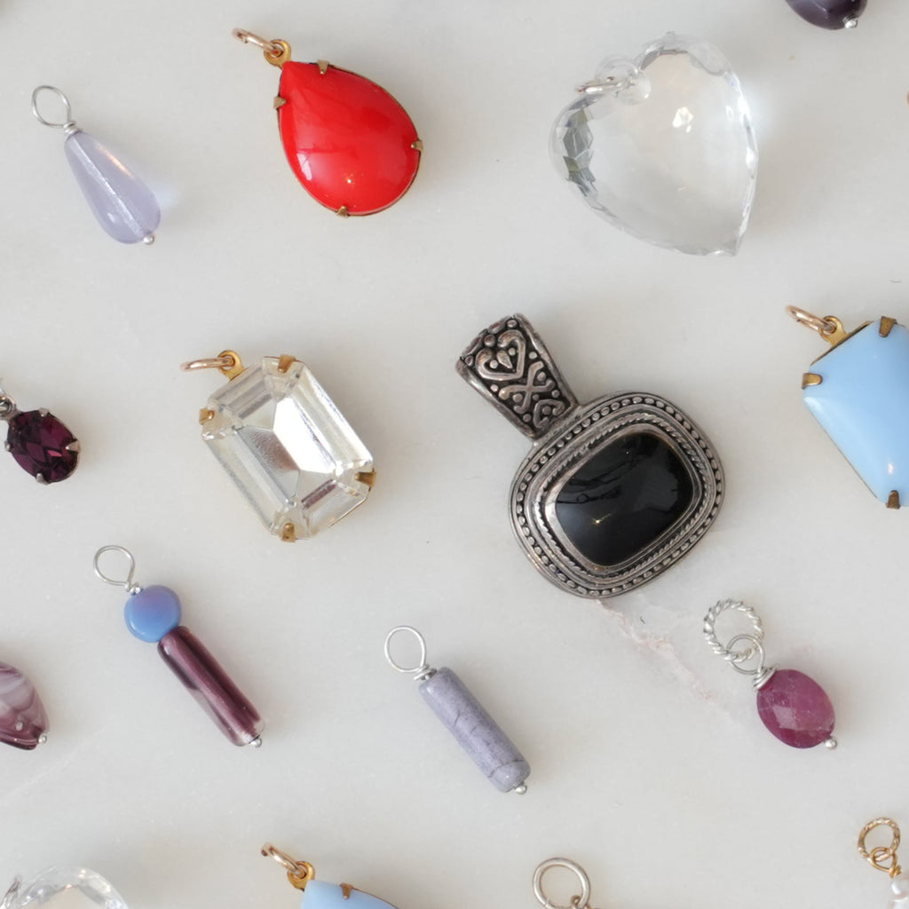 Vintage glass and brass cabochons in faceted clear and neutral tones and enameled brass shapes with 14kt gold fill or sterling silver rings. Pretty little subtle treasures to add to your charm bracelets and necklaces.