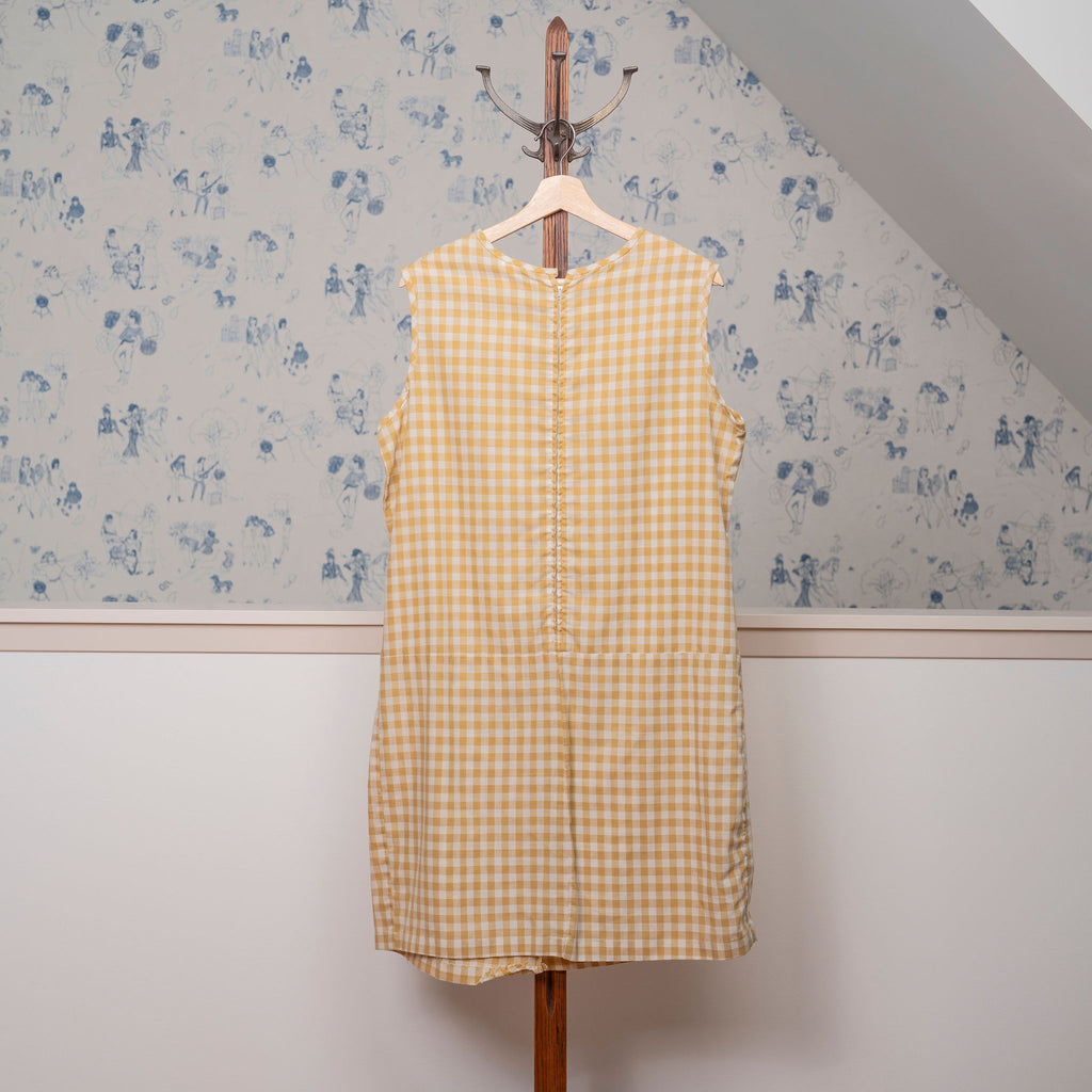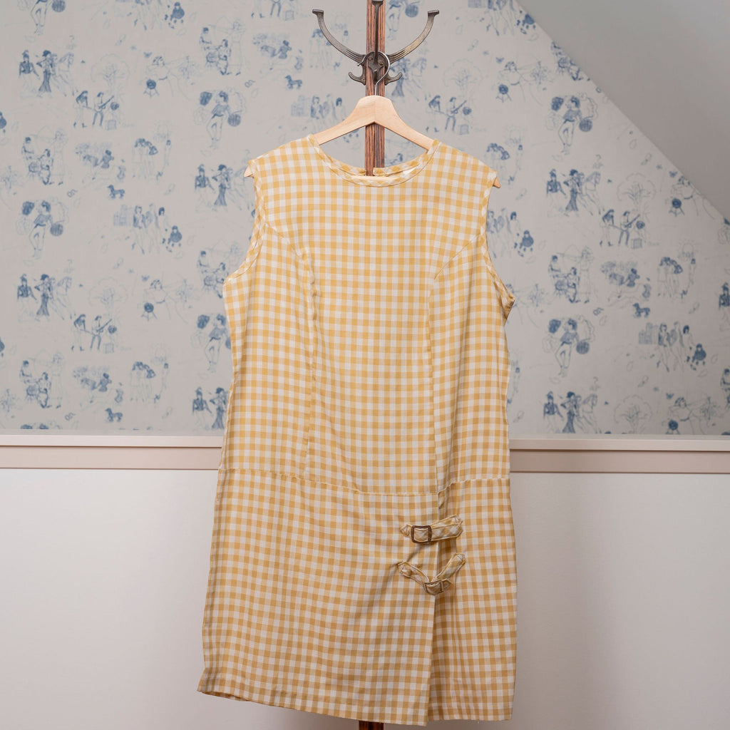 Vintage 1960s Gold Gingham Shift Dress with Buckle Details