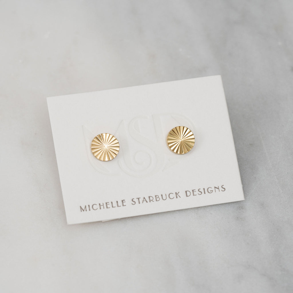 Tiny vintage brass starburst circles. Earrings are soldered to sterling silver posts, then polished and sealed with a clear varnish.