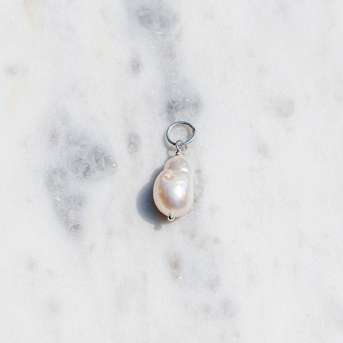 Assorted white freshwater pearls in varying shapes and sizes on closed rings and loops large enough to string onto most chains, attach to front clasp necklaces, or add to charm bracelets and necklaces.