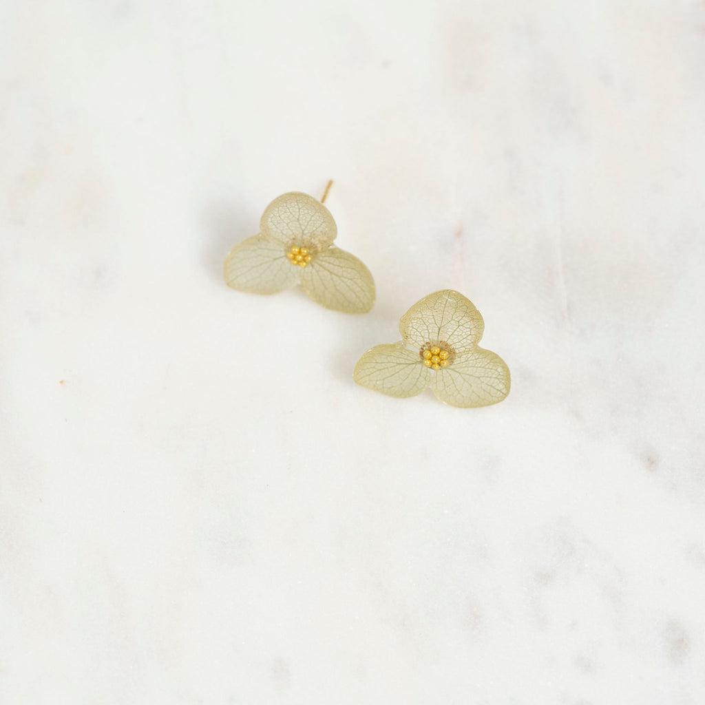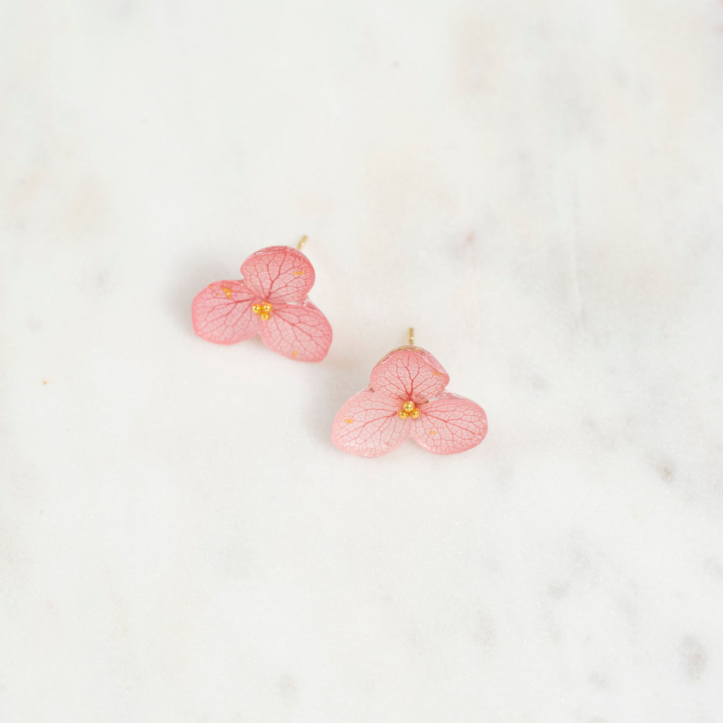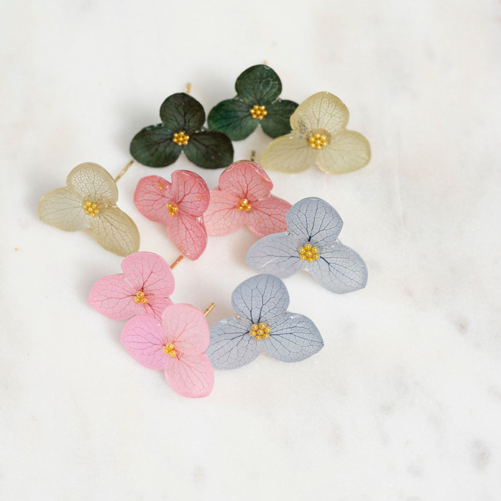 Shu WangIndividual hydrangea petals are collected and captured in layers of jewelers grade resin and assembled into pretty little lightweight stud earrings.