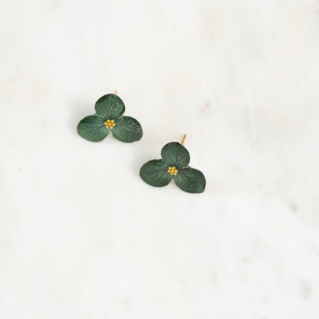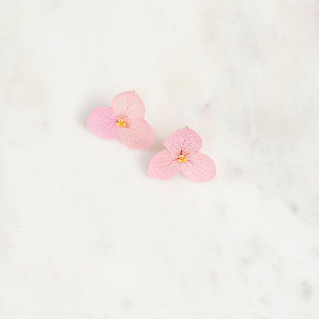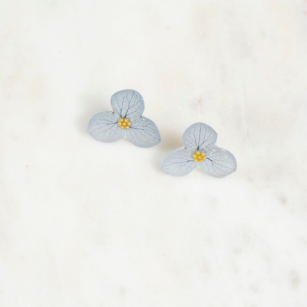 Shu WangIndividual hydrangea petals are collected and captured in layers of jewelers grade resin and assembled into pretty little lightweight stud earrings.
