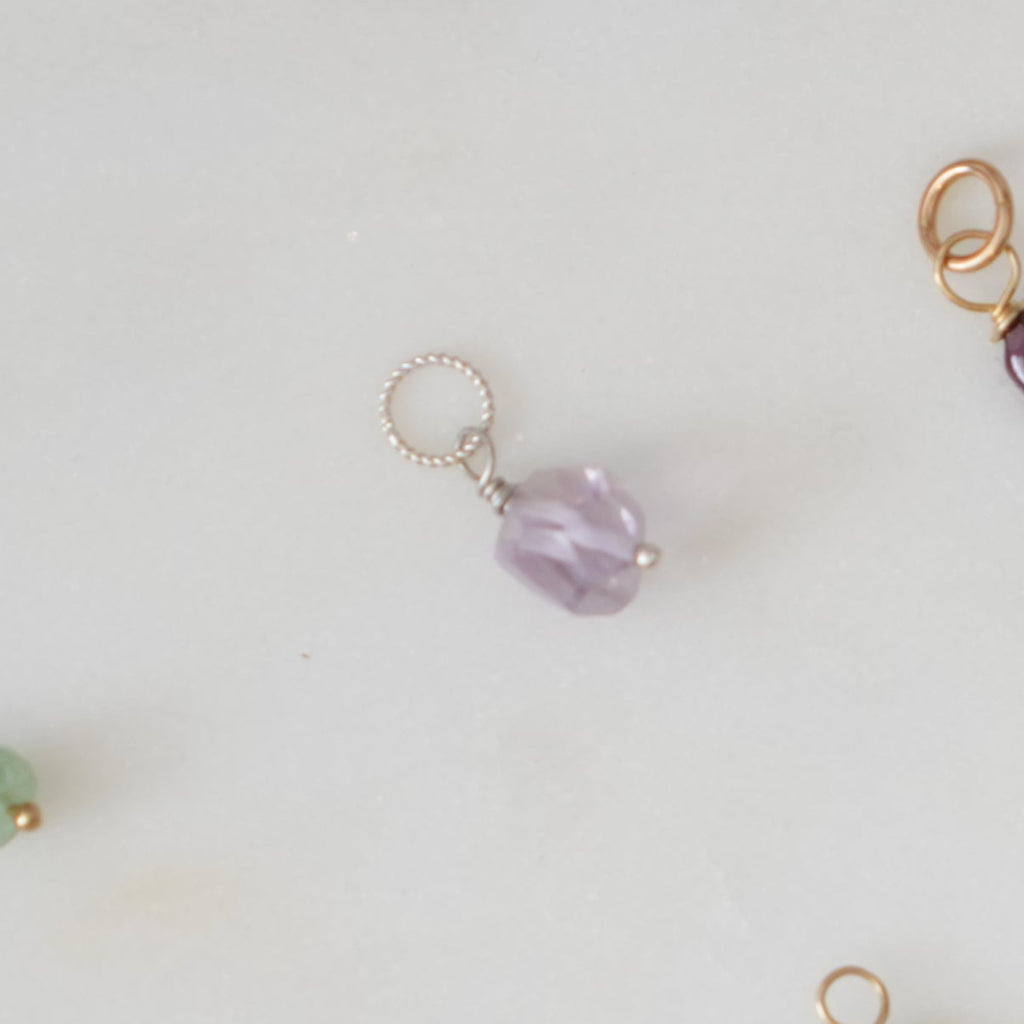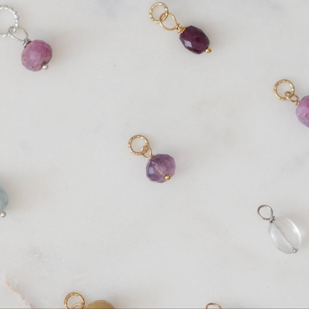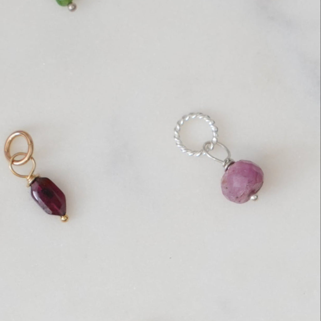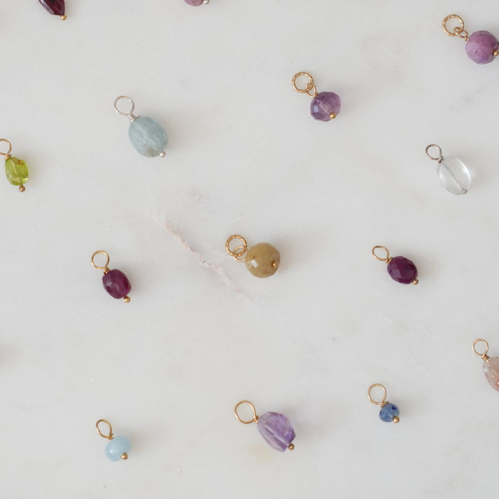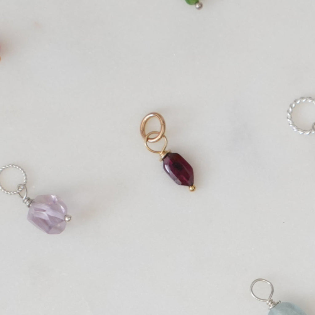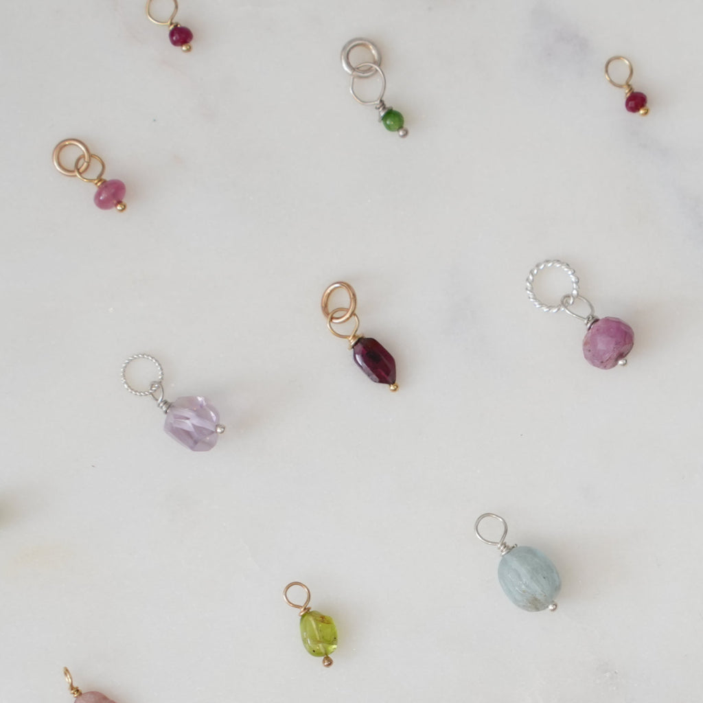 Stunning birthstone gems on sterling silver and 14kt gold fill with loops or rings large enough to string onto most chains, attach to front clasp necklaces, or add to charm bracelets and necklaces.