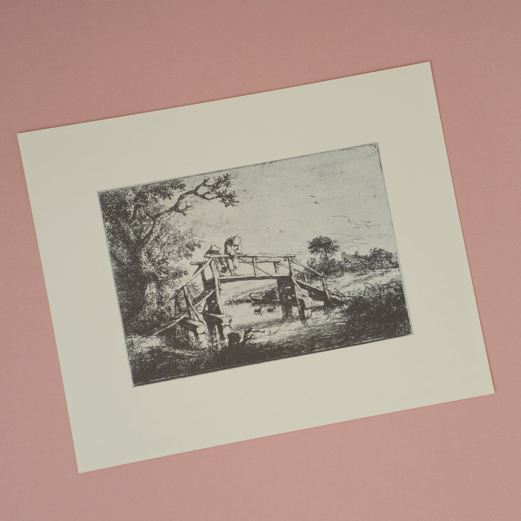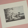 Vintage 1974 black and white art plate affixed to chipboard backing for maximum ease in styling, propping, or framing.