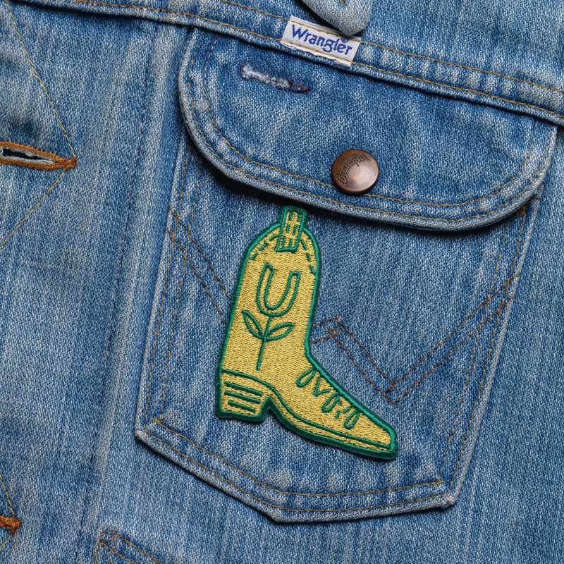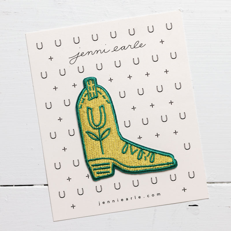 Woven lucky cowboy boot with a mustard yellow background and kelly green accents.
