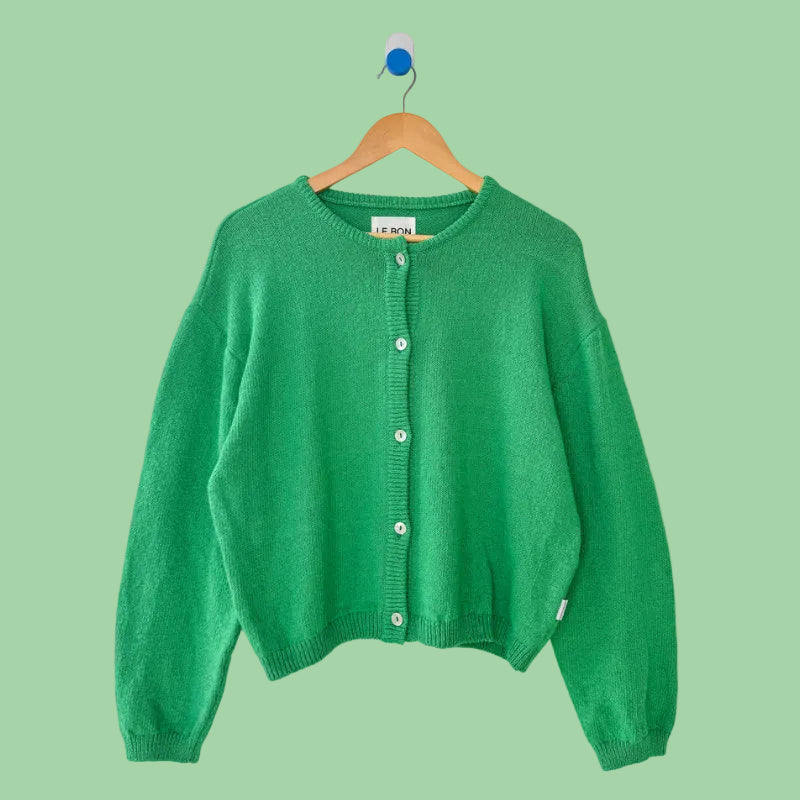 Le Bon ShoppeThe perfect cross between Le Bon Shoppe's Leila Mohair Cardigan and Milo Cotton Sweater, the Leila Cotton Cardigan blends familiar fit and design details from the mohair version with the ease of a 100% cotton knit. It features a relaxed silhouette with a standard length, finished with authentic shell buttons for an elevated touch. Lightweight and airy, this cotton sweater layers effortlessly up or down. Wear it over a tee and pants or draped over the shoulders with a dress.
