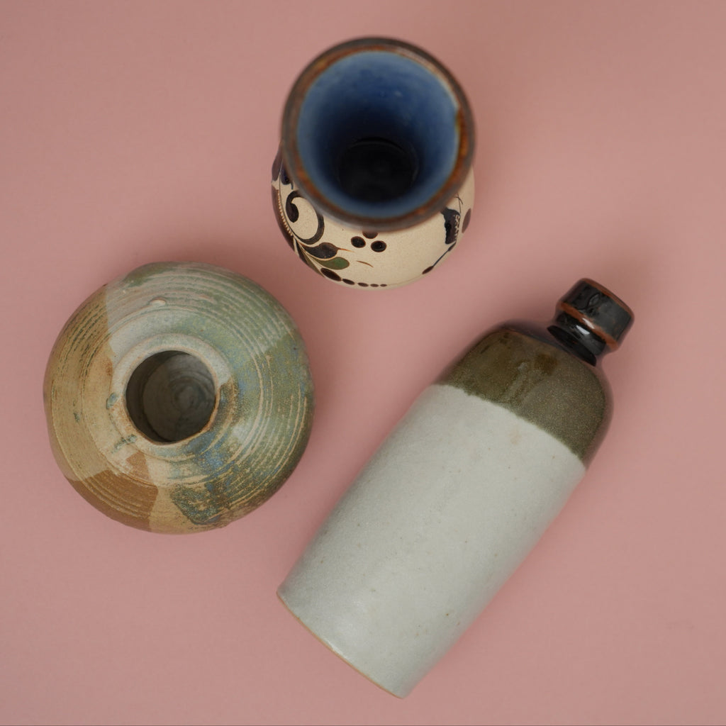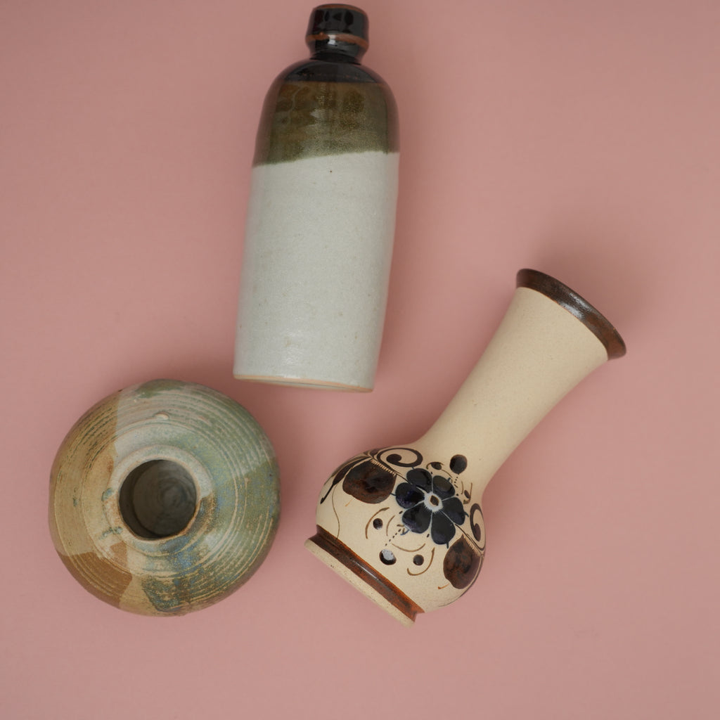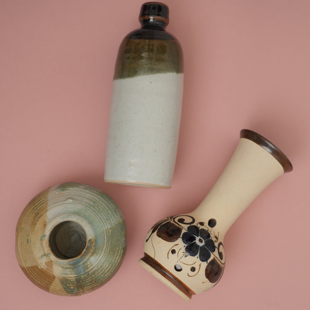 Assorted vintage ceramic and pottery vases curated and collected to add story and charm to any tableau.