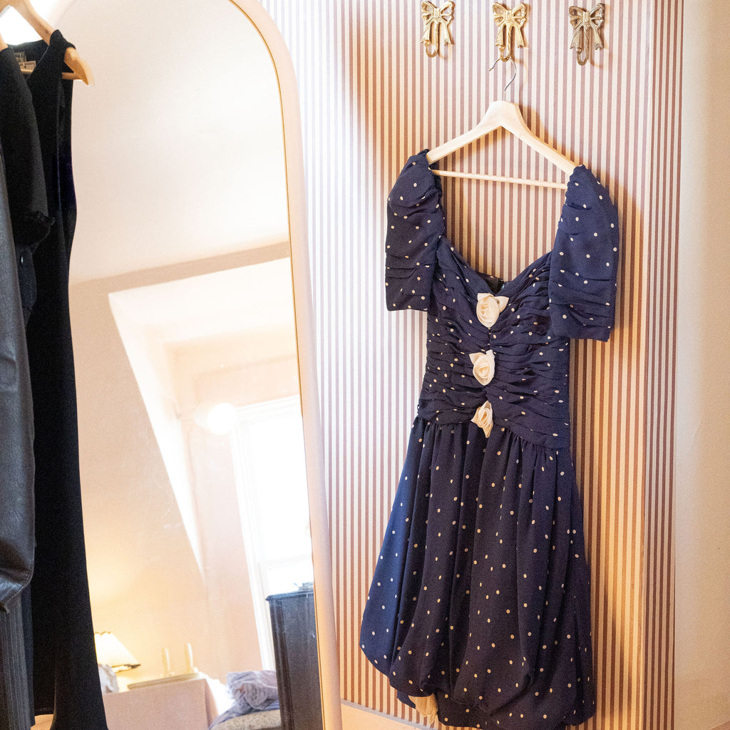 J'adore BeddorVintage “Jarin” navy polka dot dress with white rosettes. Cinched at the bottom with a cute balloon effect.