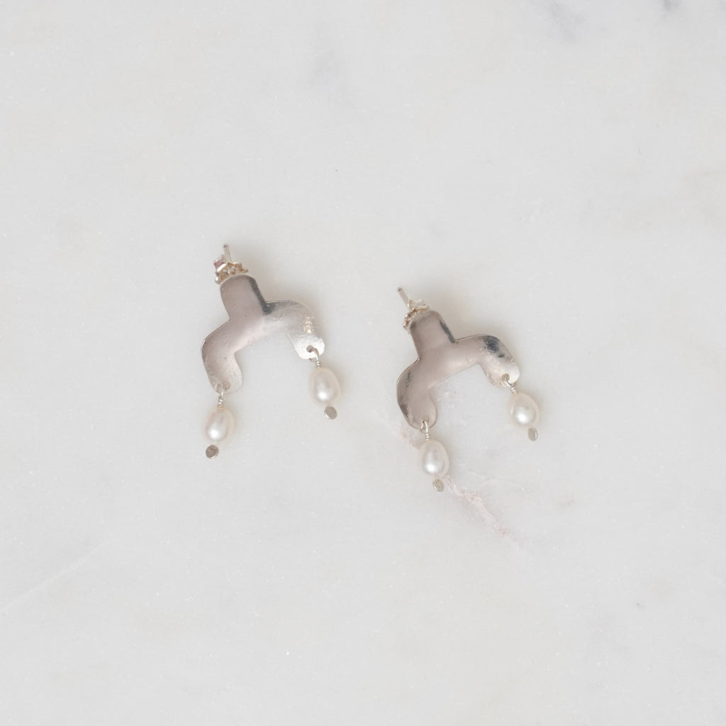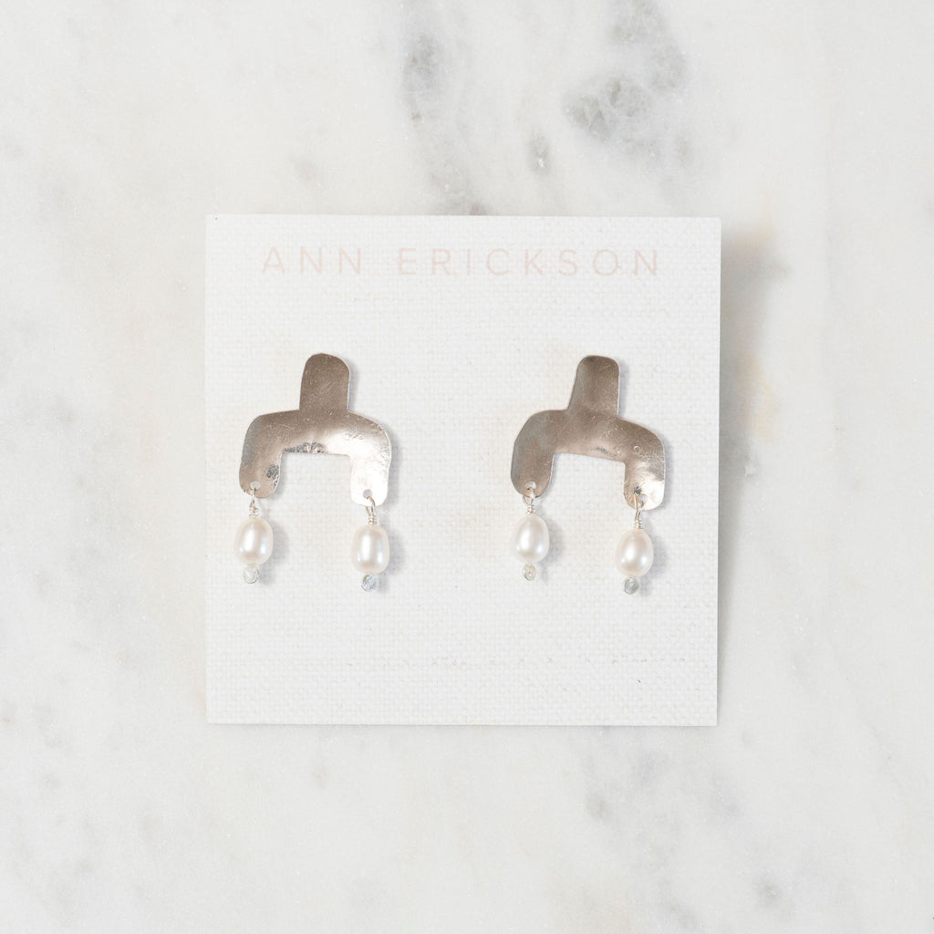 Ann EricksonHand fabricated and textured sterling silver stud earrings with pearl drops. Made with sterling silver posts and backs.