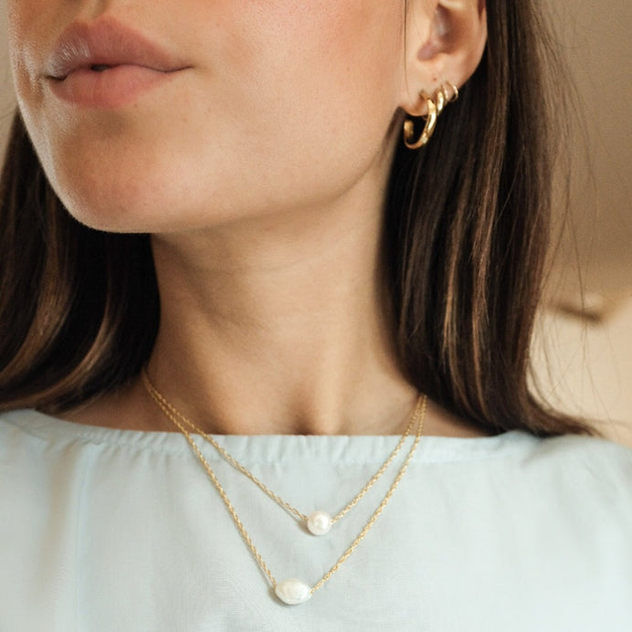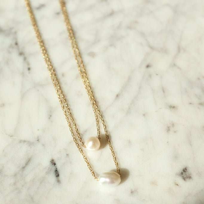 Protextor ParrishYour choice of large round or oblong pearl threaded onto 16" or 18" 14 kt gold fill or sterling silver chain with small pearl detail at clasp.