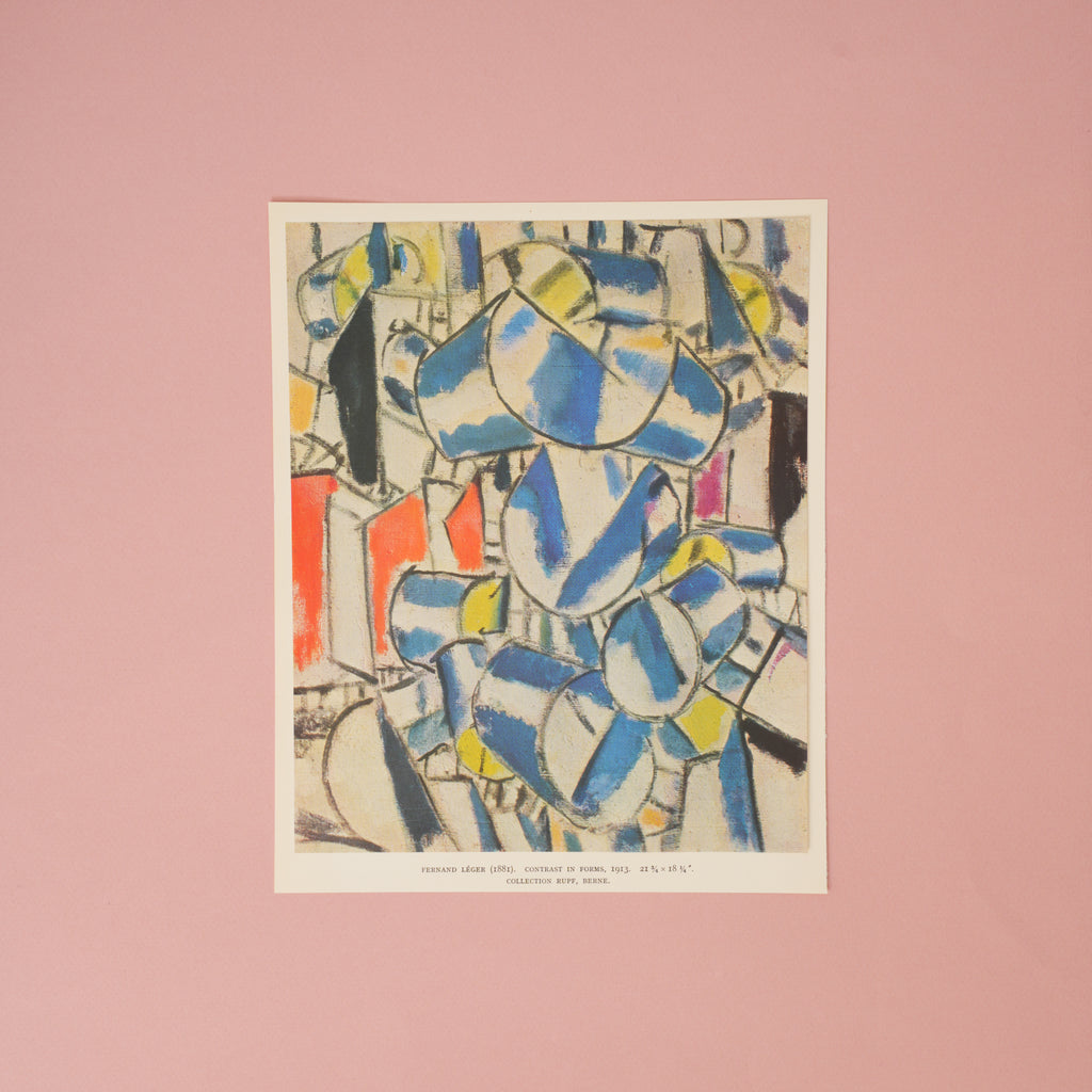 A charming vintage 1950 tipped in art print of Contrast in Forms (1913) by Fernand Léger. Image hand tipped-in on a sheet of heavy paper and affixed to chipboard backing for maximum ease of styling and propping.