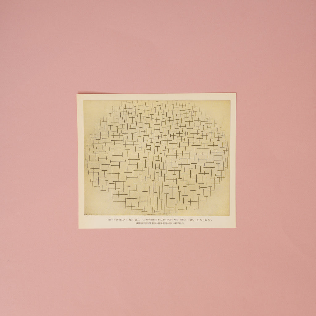 A charming vintage 1950 tipped in art print of Composition No. 10, Plus and Minus (1915) by Piet Mondrian. Image hand tipped-in on a sheet of heavy paper and affixed to chipboard backing for maximum ease of styling and propping.