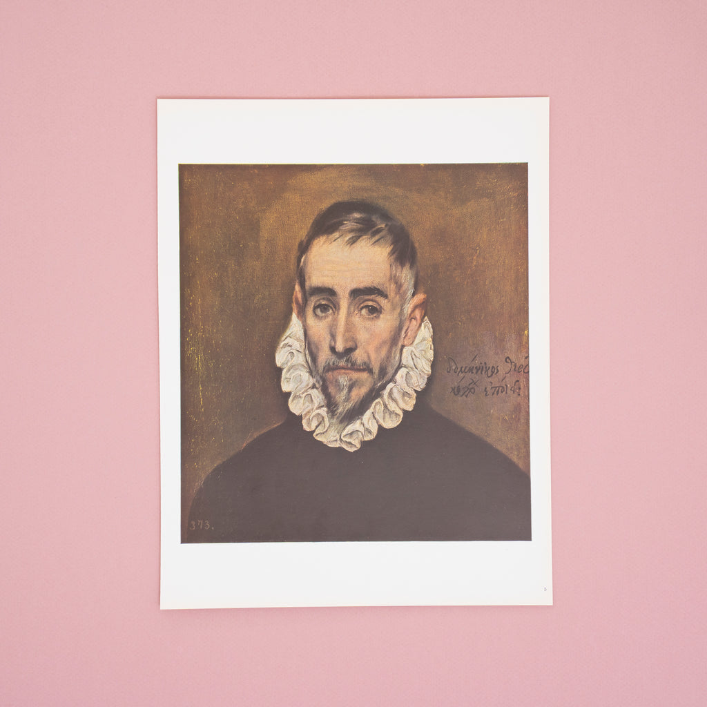 GOLDEN RULE GALLERY VINTAGE ARTA mid-century print of El Greco's Portrait of an Unknown Man (about 1600) on 9" x 11.75" thick glossy paper with hints of patina.